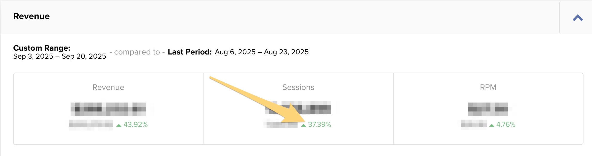 Sessions for the selected date range increased by 37.39%, which tells us that in-content ads did not increase at the same rate as sessions, indicating an overall decrease in the number of in-content impressions per session.