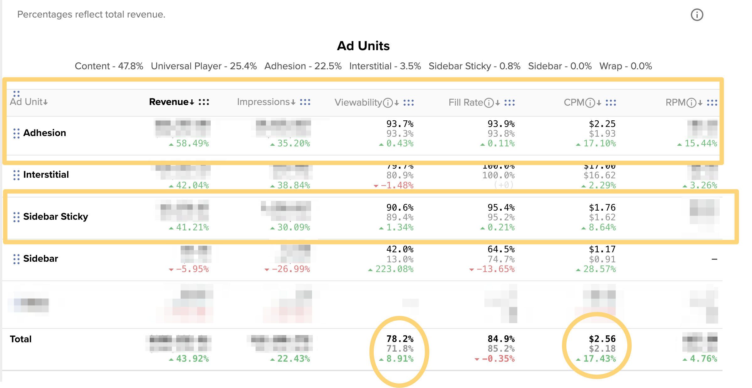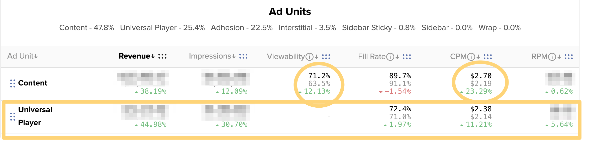 In most cases, you are looking for In-Content Ads to decrease as a % of revenue, and for the Universal Player, Adhesion, and Sticky Sidebar Ads to increase as a % of revenue. If you serve Recipe Card Ads, you should likely also see those increase as a % of revenue.